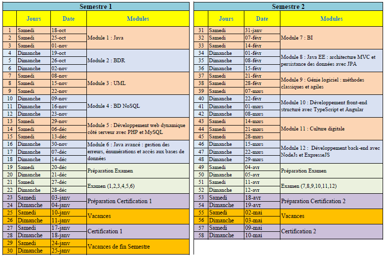 Dans le tableau ci-dessous, vous trouverez les modules enseignés ainsi que le planning.