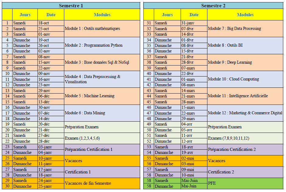 Dans le tableau ci-dessous, vous trouverez les modules enseignés ainsi que le planning.